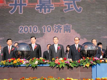“2010年山東臺(tái)灣名品博覽會(huì)”昨日在山東濟(jì)南展開,山東省委書記姜異康(左二)和臺(tái)灣外貿(mào)協(xié)會(huì)董事長(zhǎng)王志剛(右三)共同出席開幕典禮。圖片來源:臺(tái)灣中國(guó)時(shí)報(bào)