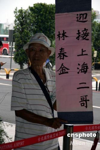 兩岸周末包機七月四日啟程,臺灣社會各界關注。二十歲來到臺灣的老伯林振鳳一大早從臺南趕到臺北松山機場,接搭乘兩岸周末包機八十四歲的二哥林春金。這將是林振鳳老人自十六年前臺灣當局開放到大陸探親后,他再次與兄弟相見。 中新社發 徐長安 攝