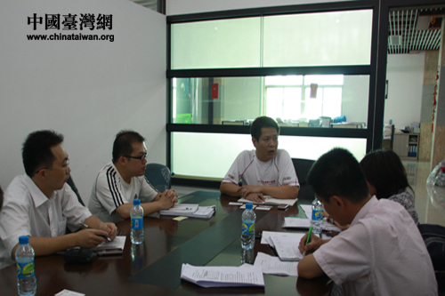 鵬程實業(yè)有限公司管理人員陪同臺企轉(zhuǎn)型升級服務(wù)團及專家觀看企業(yè)宣傳片。(中國臺灣網(wǎng) 胡珊珊 攝)