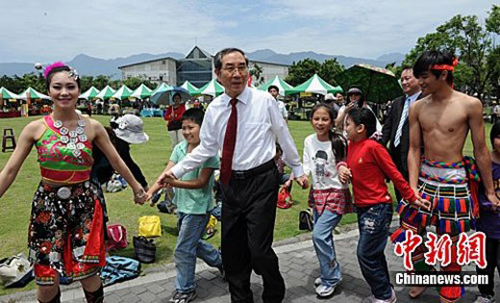 4月25日,率廣西經貿文化代表團訪問臺灣花蓮縣的廣西壯族自治區主席馬飚和當地民眾手拉手跳起圓圈舞,場面十分歡快。中新社發 林艷華 攝