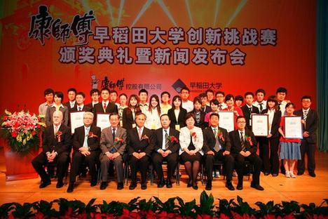 11日,一場以“康師傅的創新實踐”為主題的創新挑戰賽在北京大學百年講堂落下帷幕。本屆創響新生代”康師傅-早稻田大學創新挑戰賽自2010年1月啟動以來,一直受到社會創新人士和大學生的積極響應,在大賽組委會收集到的近300份提案中,歷經專業評委嚴格的評審,最終有20份提案過關斬將,最終入圍決賽。這20份提案內容涉及產品、營銷、服務及公益等不同層面。6月11日上午,20支團隊進行提案面呈,之后經歷6人專家評委團的嚴格“拷問”,最終“面!面俱到”提案團隊、“Let's Noodle!客制化泡面自動販賣機”提案團隊和“康師傅Lifestyle動力快車”提案團隊分別獲得大賽金、銀、銅獎,還有中國政法大學等五支團隊榮獲優勝獎。此外,根據官網票選結果,“最佳網絡人氣獎”頒發給了福州大學“活力樹”提案團隊。頒獎典禮在當日下午的北大百年講堂多功能廳進行,主辦方康師傅、早稻田大學的高層領導、北京大學等高校嘉賓與20個參賽團隊,以及來自全國的近50家媒體共同見證這一激動人心的頒獎時刻。之后,在決賽隊伍中預計有19名參賽者每人將獲得兩年超過40萬的獎學金,入讀世界名校早稻田大學。