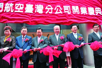 中國(guó)國(guó)民黨榮譽(yù)主席吳伯雄(右三)、海基會(huì)董事長(zhǎng)江丙坤(右二)等與廈航總經(jīng)理車尚輪(左三)共同出席廈航臺(tái)灣分公司剪彩儀式。