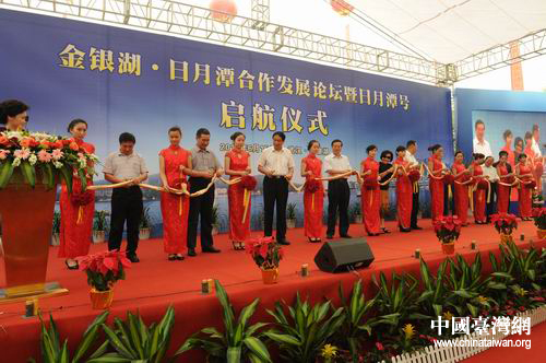 “金銀湖—日月潭合作發展論壇”暨“日月潭號”游船啟航儀式在武漢舉行,圖為兩岸嘉賓為啟航儀式剪彩。(湖北省臺辦 陸勝 攝)
