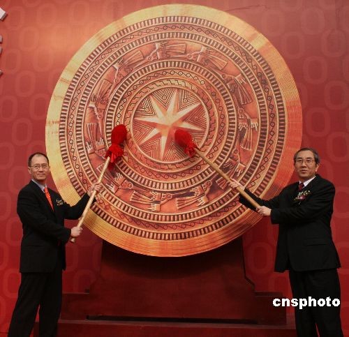 12月5日,臺泥貴港廠舉行竣工慶典,廣西壯族自治區(qū)主席馬飚(右)和董事長辜成允(左)共同擊鼓啟動竣工儀式。臺泥貴港廠計劃總投資36億元,目前已完成投資26.35億元,隨著該廠4條日產(chǎn)6000噸水泥熟料生產(chǎn)線的順利竣工,臺泥在大陸市場的規(guī)劃產(chǎn)能已突破2400萬噸。 中新社發(fā) 林艷華 攝
