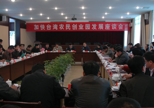 3月9日,海峽兩岸(福建)農業合作實驗區工作領導小組辦公室在三明永安召開“加快臺灣農民創業園發展座談會”,進一步貫徹落實胡錦濤總書記給在閩臺農回信重要精神,部署加快推進臺灣農民創業園發展工作。福建省農業廳黨組書記檀云坤、福建省農業廳海峽合作處處長陳論生、福建省發改委農業處副調研員林愛武、福建省臺辦經濟處處長謝續華、福建省林業廳產業處副主任科員伍清亮、福建省實驗區建設領導小組部分成員單位、各設區市實驗區辦、臺灣農民創業園負責人出席了會議。
