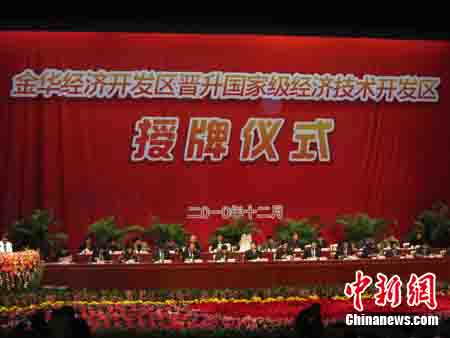 中新網金華12月15日電(記者嚴格 胡旭明)今天上午,金華開發區晉升國家級經濟技術開發區授牌儀式在金華隆重舉行。浙江省副省長龔正、商務部部長助理房愛卿向金華經濟技術開發區授牌。金華開發區也將成為浙中唯一一家國家級經濟技術開發區。