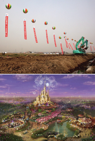 以中國紅為主色調的舞臺,數十只印有龍紋、青花等中國元素的金黃色大鼓、4幅卷軸式的大屏幕、穿著唐裝蹦蹦跳跳的米老鼠唐老鴨……4月8日,上海浦東川沙鎮,在一片荒蕪的土地上臨時搭建的迪士尼劇場中,上海迪士尼樂園的開工儀式正式啟動。