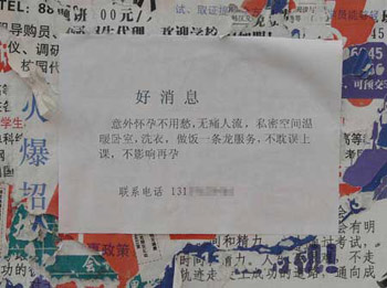 記者了解到,“人流”廣告進(jìn)校園并不是個(gè)別現(xiàn)象。劉蓮今年剛剛從貴州大學(xué)畢業(yè),據(jù)她介紹,她在校時(shí),時(shí)常有人把“人流”廣告塞到寢室門縫里,幾乎每個(gè)寢室都不止一次收到過類似的廣告。在校園廣告欄和一些集中貼小廣告的地點(diǎn),也悄悄出現(xiàn)了關(guān)于“人流”的廣告。