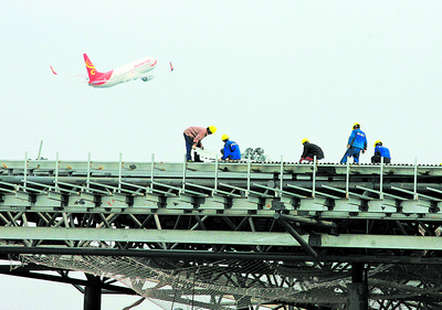黃花機場新航站樓建設工地現場,施工人員正在鋼架上安裝頂板。上半年長沙重大項目建設投資保持快速增長。