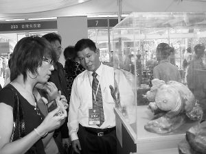 “藝博會(huì)”開幕當(dāng)天,臺(tái)灣苗栗縣三義木雕協(xié)會(huì)的張家琪就與一位上海的客商做成了一筆生意。他特地向觀眾介紹一件兩岸合作的參展作品《一鼓作氣》,他說,作品是臺(tái)灣最著名的蟾蜍雕刻師施振木用大陸的老鼓作底座,在上面雕刻一只金蟾蜍,寓意“兩岸和平才是最大的財(cái)氣!”(許海生 攝)