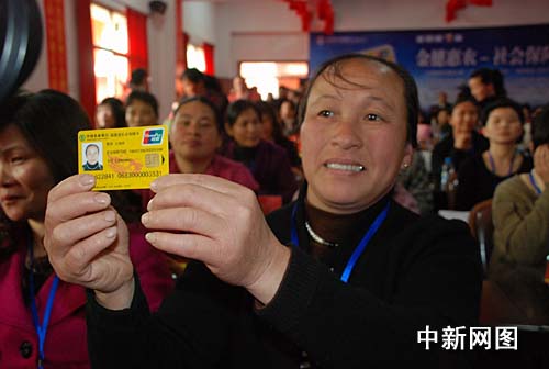 22日下午,全國首張 “金穗惠農——社會保障卡”發卡儀式在福建泉州崇武鎮潮樂村舉行。潮樂村首批領到惠農社保卡的農民正向記者展示她的社保卡。作者:郭斌