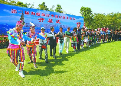第二屆海峽兩岸少數民族豐收節上,兩岸民眾手牽著手,載歌載舞。記者 關建東 攝