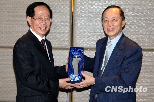 5月20日,海峽兩岸農業交流協會與臺灣二十一世紀基金會在臺北舉行座談會,并簽訂2010年合作備忘錄。圖為二十一世紀基金會董事長、前臺南縣長高育仁(右)向首度訪臺的海峽兩岸農業交流協會名譽會長危朝安贈送禮品,禮品上刻“研發 創新 和平”等字樣。 中新社發 董會峰 攝