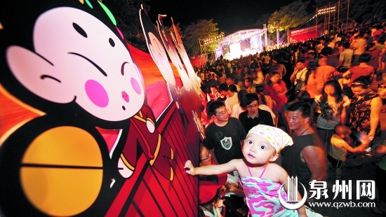 昨晚,一名小朋友在文化創意產品市集上被卡通式的火鼎公婆所吸引。當晚,泉州市首屆創意文化節開幕式暨音樂文化表演在市區府文廟廣場拉開帷幕,活動中各種創意十足的飾品、服裝、玩具等文化創意產品吸引了眾多市民的眼球。(張九強 攝)