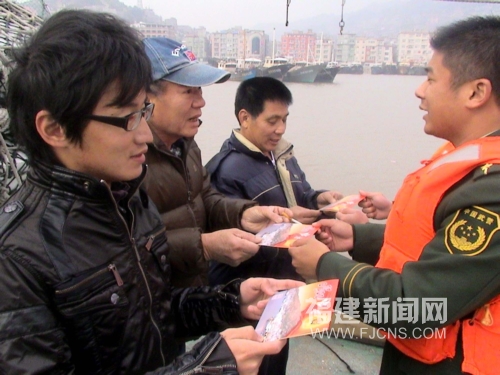 新年伊始,福建霞浦三沙邊防官兵帶著吉祥水果和新春祝福賀卡,登上靠泊的臺輪,為在港臺胞們送去誠摯的節日祝福。(王力鵬 攝)