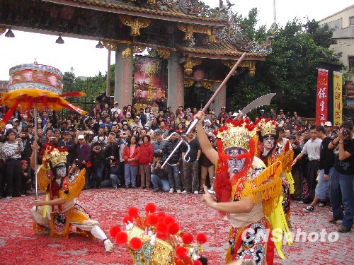 兩岸信眾在臺北保安宮前為保生大帝慶生而舉辦的盛大民俗廟會藝陣表演從上午10時拉開帷幕,來自高雄的農民兄弟率先獻演一場精彩的“宋江陣”。而后車鼓陣、花鼓陣、高蹺陣、十二婆祖陣、八家將等傳統的閩南廟會表演藝陣也紛紛登場,數以千計的臺灣民眾駐足觀賞,保安宮廟埕前四周人頭攢動。