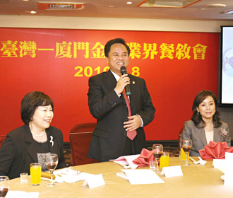 廈門市長劉賜貴(中)率廈門經貿文化交流考察團,8日與“金管會副主委”李紀珠(右)、臺灣金控董事長張秀蓮(左)等臺灣金融界人士座談;劉賜貴表示,廈門將建設兩岸金融合作試驗區,打造兩岸區域性金融服務中心,提供臺灣金融界進入大陸發展的良機。