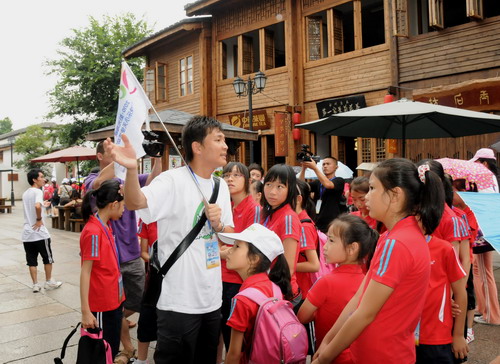 當日,“2010·陽光海峽——兩岸快樂小天使活動營”的小朋友來到福州三坊七巷,體驗老街民俗文化。“2010·陽光海峽——兩岸快樂小天使活動營”7月5日在福州開營,來自臺灣的近百名小朋友與大陸小朋友歡聚一堂,他們將共同在福州、泉州、廈門等地度過一段為期8天的美好時光。新華社發(張晨岑 攝)