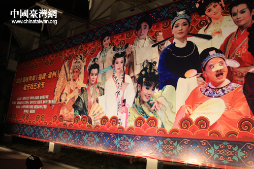 臺灣明華園黃字劇團與漳州市薌劇團同臺獻演大型歌仔戲《周公法斗桃花女》,圖為活動現場宣傳展板。(中國臺灣網 胡珊珊 攝影)