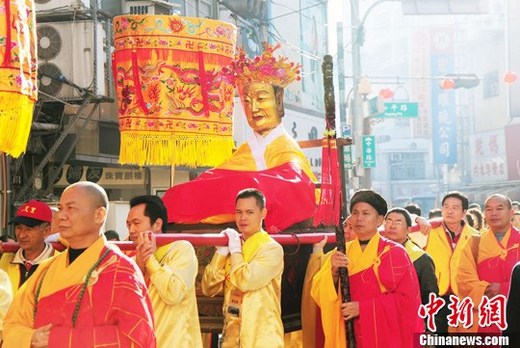 12月24日,被譽(yù)為“客家保護(hù)神”的福建武平縣均慶寺定光佛金身,結(jié)束了為期8天的在臺(tái)灣首度巡游活動(dòng),取道金門,返回大陸。圖為武平定光佛金身在臺(tái)灣巡游時(shí)的情形。