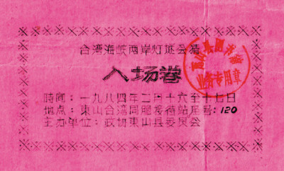 我喜歡收藏各種類型的門券,在收藏的形形色色門券中,有一張最為特別、簡單和罕見。這就是27年前,也就是1984年元宵節福建省東山島舉行的臺灣海峽兩岸燈謎會猜入場券。看到這張粉紅色的特殊入場券,我的記憶又回到當年氣氛熱烈的燈謎猜射場景中。