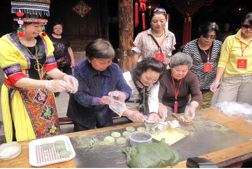 兩岸“十佳婆媳”代表在滕頭村現(xiàn)場(chǎng)制作青團(tuán)。