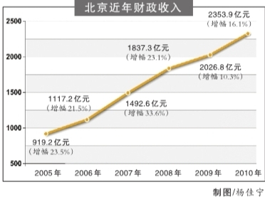 本報訊(記者趙鵬)記者昨天從北京市財政局獲悉,2010年,全市地方財政收入完成2353.9億元,比上年增長16.1%。“十一五”時期,全市地方財政收入累計完成8827.8億元,是“十五”時期的2.7倍,年均增長20.7%。