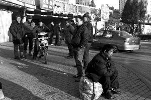 11日,六里橋下西南角,農民工聚在一起等著找工作。本報記者 孫純霞 攝
