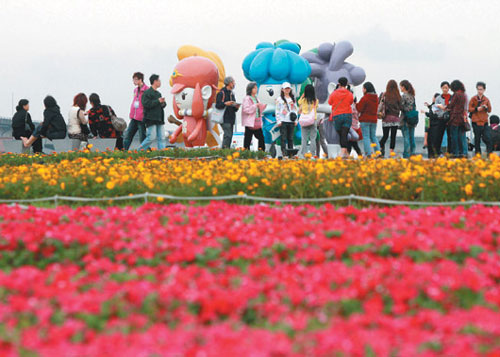 臺北花卉博覽會6日開幕,大批民眾涌進大佳園區,在五彩繽紛的花海前與花博吉祥物合影。 圖片來源:臺灣《聯合報》