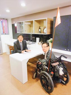 臺北市都發局長丁育群(左)與自由空間基金會董事長唐峰正,體驗新落成的全能住宅。 圖片來源:中國時報