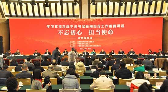 2017年1月17日,由全國(guó)政協(xié)文史和學(xué)習(xí)委員會(huì)支持,中國(guó)新聞文化促進(jìn)會(huì)主辦的學(xué)習(xí)貫徹習(xí)近平總書記新聞?shì)浾摴ぷ髦匾v話“不忘初心 擔(dān)當(dāng)使命”專題座談會(huì)在北京釣魚臺(tái)國(guó)賓館舉行。全國(guó)人大常委、全國(guó)人大常委會(huì)教科文衛(wèi)委員會(huì)主任委員柳斌杰,人民日?qǐng)?bào)社副總編輯盧新寧,全國(guó)政協(xié)常委韋建樺、張海濤,全國(guó)政協(xié)委員卞晉平、金學(xué)鋒、李東東、于芳、王濤、艾克拜爾·米吉提、龍新南、鄔書林、張丕民、張曉林、郝振省、海霞、黃書元、黃國(guó)柱,解放軍報(bào)社副社長(zhǎng)兼政治部主任雷雨,中宣部出版局巡視員、副局長(zhǎng)劉建生,國(guó)家新聞出版廣電總局新聞報(bào)刊司司長(zhǎng)李軍,中央網(wǎng)信辦網(wǎng)絡(luò)社會(huì)局副局長(zhǎng)孫愛(ài)萍,以及中國(guó)新聞文化促進(jìn)會(huì)副理事長(zhǎng)、常務(wù)理事、理事、新聞界文化界代表近200人出席會(huì)議。