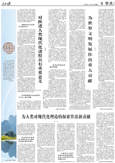 習近平總書記在黨的二十大報告中指出:“中國式現代化為人類實現現代化提供了新的選擇,中國共產黨和中國人民為解決人類面臨的共同問題提供更多更好的中國智慧、中國方案、中國力量”。中國式現代化的成功實踐,深刻改變著中國,也深刻影響著世界。在人類現代化進程、人類文明發展進程上,中國式現代化正在書寫怎樣的嶄新篇章?本期學術版對此進行探討。