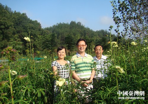 李樹金陪同縣臺(tái)聯(lián)副會(huì)長(zhǎng)胡遼云在三陽黃蜀葵種植基地看長(zhǎng)勢(shì)。(圖片來源:歙縣臺(tái)辦)