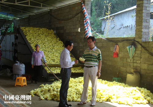 李樹金向縣臺(tái)聯(lián)顧問吳政介紹收購(gòu)黃蜀葵花后集中烘干、銷售情況。(圖片來源:歙縣臺(tái)辦)