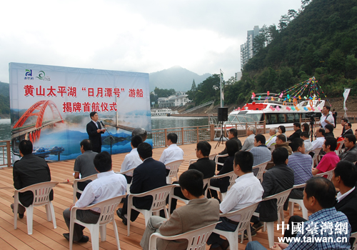 中國臺灣網10月8日黃山消息 日前,太平湖“日月潭號”游船首航儀式在安徽黃山太平湖風景區隆重舉行。安徽省臺辦副主任汪泗淇出席并致辭,黃山市副市長周天偉、南投縣代縣長陳志清共同為“日月潭號”揭牌,黃山市臺辦主任余國輝出席,黃山區區長徐立秋出席并致辭。區委領導及有關部門負責人,臺灣南投縣觀光文化參訪團成員參加揭牌首航儀式。