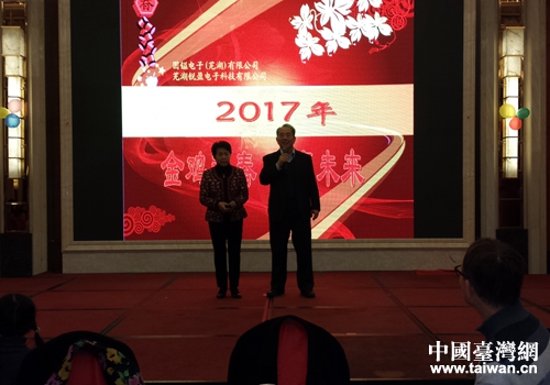 中國臺灣網(wǎng)1月17日蕪湖訊 雞報小康隨日出,年迎大有伴春來。值此辭舊迎新之際,2017年1月15日,蕪湖市臺協(xié)會長企業(yè)固鎰電子(蕪湖)有限公司和蕪湖銳盈電子科技有限公司,為了感謝全體員工一年來的辛勞和付出,在升輝西方財富大酒店舉辦了以“金雞迎春、共贏未來”為主題的2016年度尾牙聯(lián)歡會。公司董事長陳鑒章先生、總經(jīng)理陳輝章先生等公司領(lǐng)導(dǎo)和全體員工,以及特邀嘉賓湖北襄陽市鹿門山旅游集團董事長王碧緣女士和蕪湖市臺協(xié)會常務(wù)理事等共200余人參加了此次尾牙聯(lián)歡會。