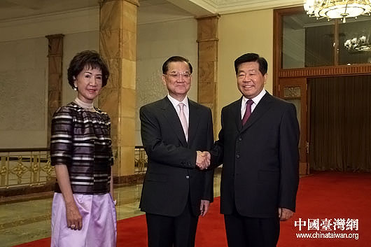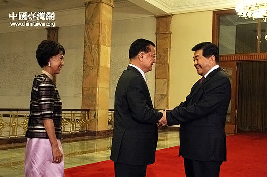 7月27日下午,中共中央政治局常委、全國政協(xié)主席賈慶林在北京人民大會堂北京廳會見了來訪的中國國民黨榮譽主席連戰(zhàn)一行。(中國臺灣網(wǎng) 鐘寶華 攝)