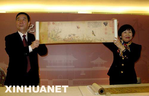 3月2日,鄭欣淼(左)與周功鑫共同展示故宮博物院贈送的宋朝趙昌的《寫生蛺蝶圖》復制品。