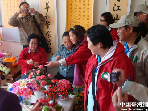 臺北里長為色彩艷麗的絹花吸引,紛紛拿出相機拍攝。圖片來源:青島晚報