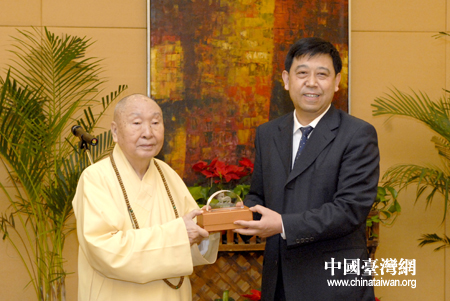 中國臺灣網5月7日西安消息 5月6日晚,陜西省臺辦主任閆超英在西安索菲特人民大廈會見臺灣中臺禪寺惟覺長老率領的赴陜參訪團一行。閆超英向惟覺長老贈送了代表陜西特色的禮品“華縣皮影”,惟覺長老回贈了中臺禪寺的“鎮寺之寶”辟邪半圓水晶模型。