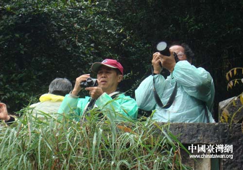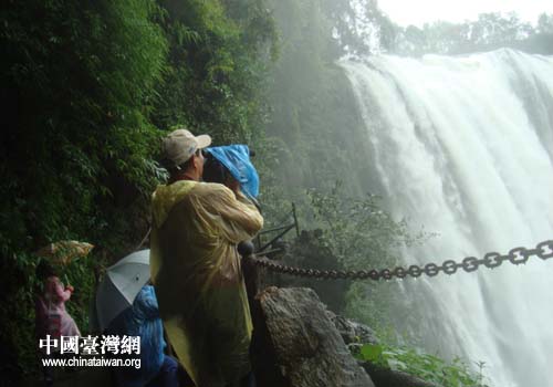 距大瀑布還有數(shù)里之遙,就看到大瀑布沖擊陣陣水霧從峽谷中涌出,伴隨隆隆水聲,記者們已感受到大瀑布的雄壯。有幾位女記者指著水霧漫起的地方,驚呼道:大瀑布在那邊!大家通過瀑布對面半山腰的觀光便道向瀑布方向走去,才看到瀑布露出部分就被吸引住了。《聯(lián)合報》記者黃宏璣、《中國時報》記者沈揮勝、《臺灣新聞網(wǎng)》記者許振澤對著瀑布不停地舉起相機(jī)、攝像機(jī)。走到瀑布正面,只見藍(lán)色的河水頃刻間變成近百米寬的白色水幕,從數(shù)十米高的懸崖上如萬馬奔騰飛馳而下,猛烈地撞擊著谷底深潭,發(fā)出雷鳴般的吼聲,濺起沖天的水霧,情景壯觀極了。半山上風(fēng)大,此時,風(fēng)夾著雨、雨伴著水霧,分不清是雨水還是霧水。驚喜的記者們身著雨衣,忙著給瀑布照相、攝影,忙著與瀑布合影。《人間福報》記者林藝斌,是臺灣著名的360度攝影大師,他到過黃果樹大瀑布多次了。他曾在安順二十多天,拍攝山水風(fēng)光、民族風(fēng)情,之后,安順臺辦編輯出版了《安順三百六十度攝影》,在大陸臺灣受到高度評價。林大師感慨道:“太美了,來了好多次了還是看不夠,到過黃果樹大瀑布的人,沒有誰說不震撼!”