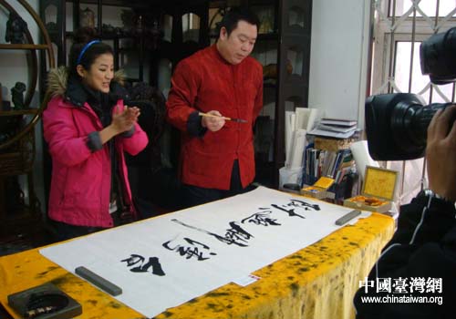 臺灣記者們專訪了遼硯傳人章永軍,了解了遼硯石材的獨特優點,以及遼硯的藝術觀賞和珍藏價值遼硯傳人。當代著名書法家、工藝美術大師章永軍還即興揮毫潑墨為節目組留下“臺灣腳逛大陸”墨寶贈送臺灣中天電視臺。(中國臺灣網本溪市臺辦通訊員 楊宏石)