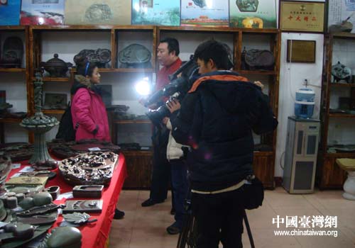 在遼硯生產基地,臺灣記者們親眼目睹了遼硯從研發、制作到成品展示的全過程。形狀各異、大小不等、顏色分明、層次多樣的硯臺、茶海及各式工藝擺件讓臺灣記者大開眼界、流連忘返。