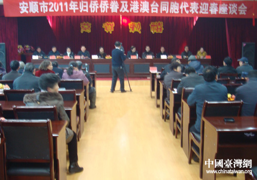 中國臺灣網1月17日安順消息 日前,貴州省安順市2011年臺胞臺屬及僑眷僑屬代表迎春座談會在安順市政協五樓會議室召開。安順市委副書記張力、市人大常委會副主任高妙、市政府副市長羅榮彬、市政協主席韋林等出席會議。