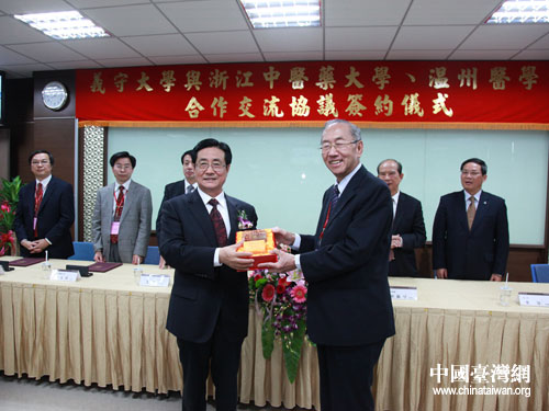義守醫(yī)學院院長贈送禮品給趙洪祝書記。(浙江臺辦王健 攝)
