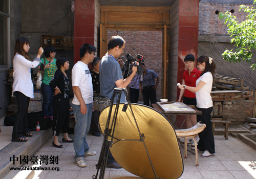 臺灣記者在拍攝炒棋子的制作過程(圖片來源:陽泉市臺辦)