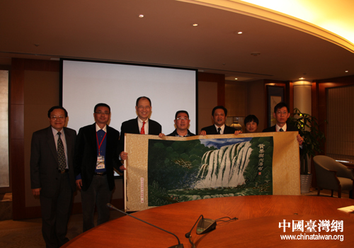 交流團領導向臺泥集團董事長辜成允先生贈送蠟染畫。(安順市臺辦 黃凱 攝)