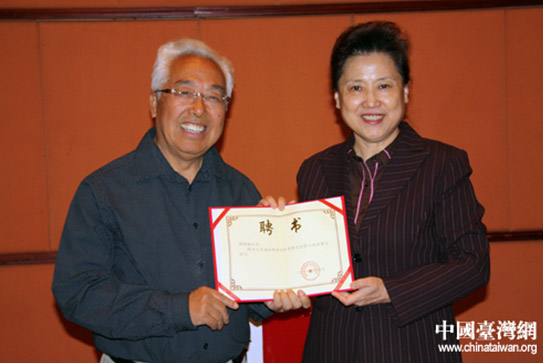 北京市臺辦主任馬玉萍向書畫名家頒發名譽顧問榮譽證書。