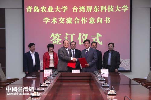 中國臺灣網5月8日青島消息 日前,臺灣屏東科技大學副校長戴昌賢一行來到青島農業大學參訪交流,兩校簽署了學術交流合作意向書,就合作辦學等事宜達成合作意向。青島農業大學副校長戴洪義會見了臺灣客人。