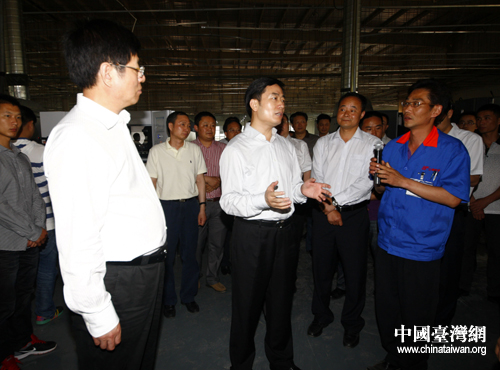 四川省副省長甘霖一行在遂寧市臺商電子產業園調研臺資企業立華新進公司。(圖片來源:遂寧臺辦)